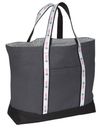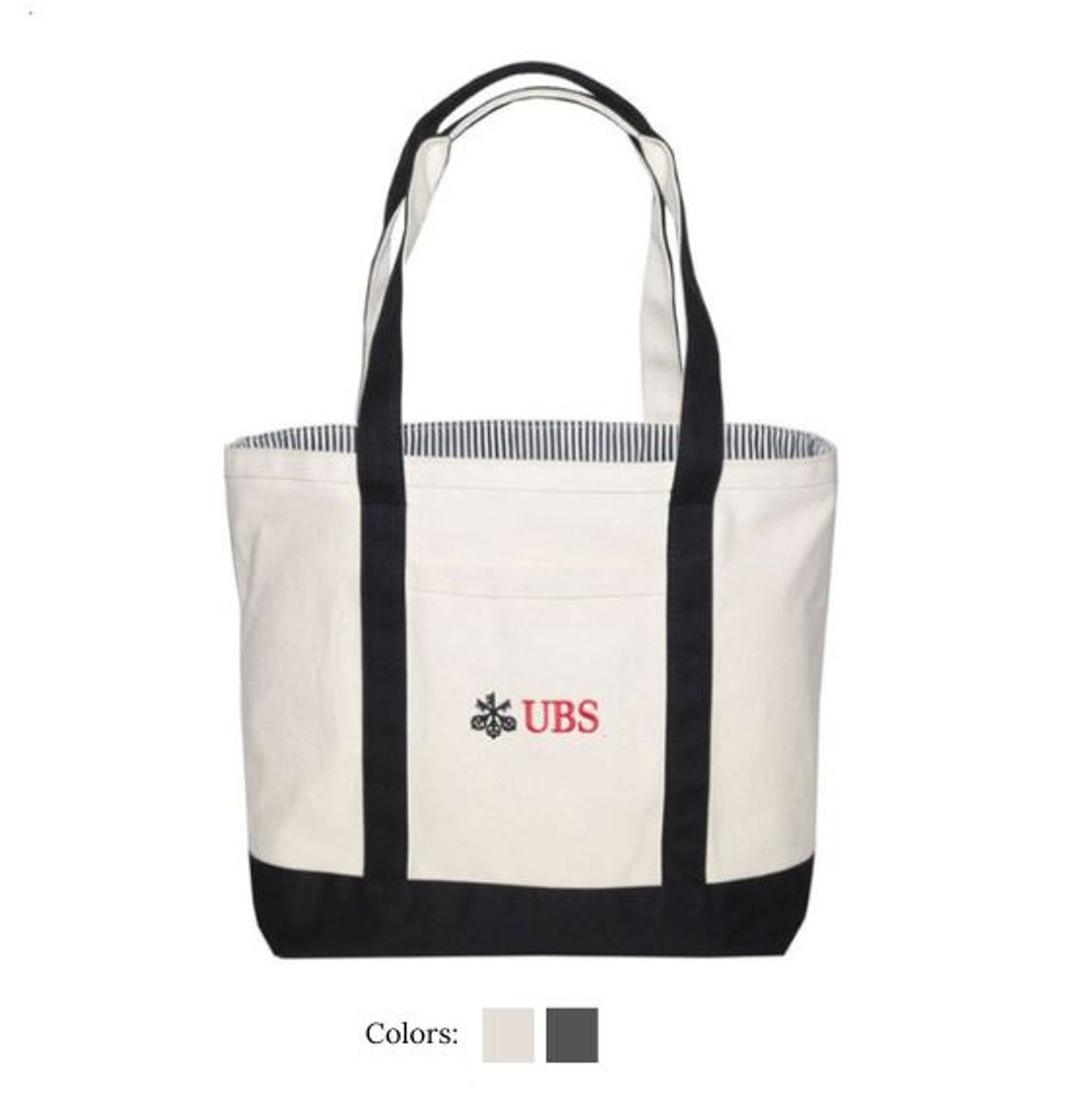 sku: UBS104This spacious boat bag features black and white striped lining and your logo embroidered on the front center pocket on the Natural Canvas Tote. The Gray Canvas Tote comes with Black webbing and bottom with your logo on the handles.Open top. Designed and manufactured in the USA exclusively by Scarborough & Tweed. Dimensions: 24”L across top, tapering to 18”L; 14”Hx8”D.