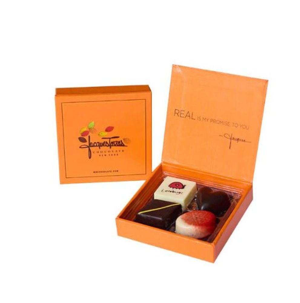 This gift box includes 4 bonbons with a printed edible center plaque made of smooth white Belgian chocolate.