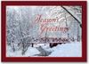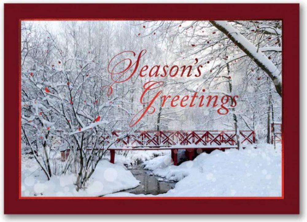 sku: UBS99673Metallic red foil frames the serene landscape on a holiday card that celebrates the beauty of a winter day spent walking through snowy woods. It will invite everyone on your list to cross the charming red bridge and let the tranquility of the season envelop them. Price Includes: Printed card with choice of blank unlined or lined envelope (white). Features the UBS logo inside the card.
