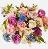 sku: STURB11With hints of blue symbolizing serenity and depth, purple evoking the essence of royalty and magic, and white roses conveying innocence and purity, this arrangement is a harmonious blend of colors and emotions.