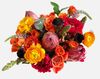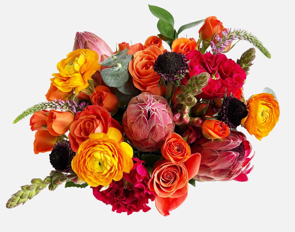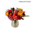 sku: STURB53Entertaining made effortless - The Hearth arrives in a stunning hammered gold short vessel that doubles as decor long after the flowers have faded. This luxurious arrangement features prickly protea, ruffled roses, gestural snapdragons, and pops of orange spray roses all expertly arranged for fall entertaining. Perfect for dinner parties where you want to impress, or as a thoughtful and sophisticated hostess gift!