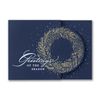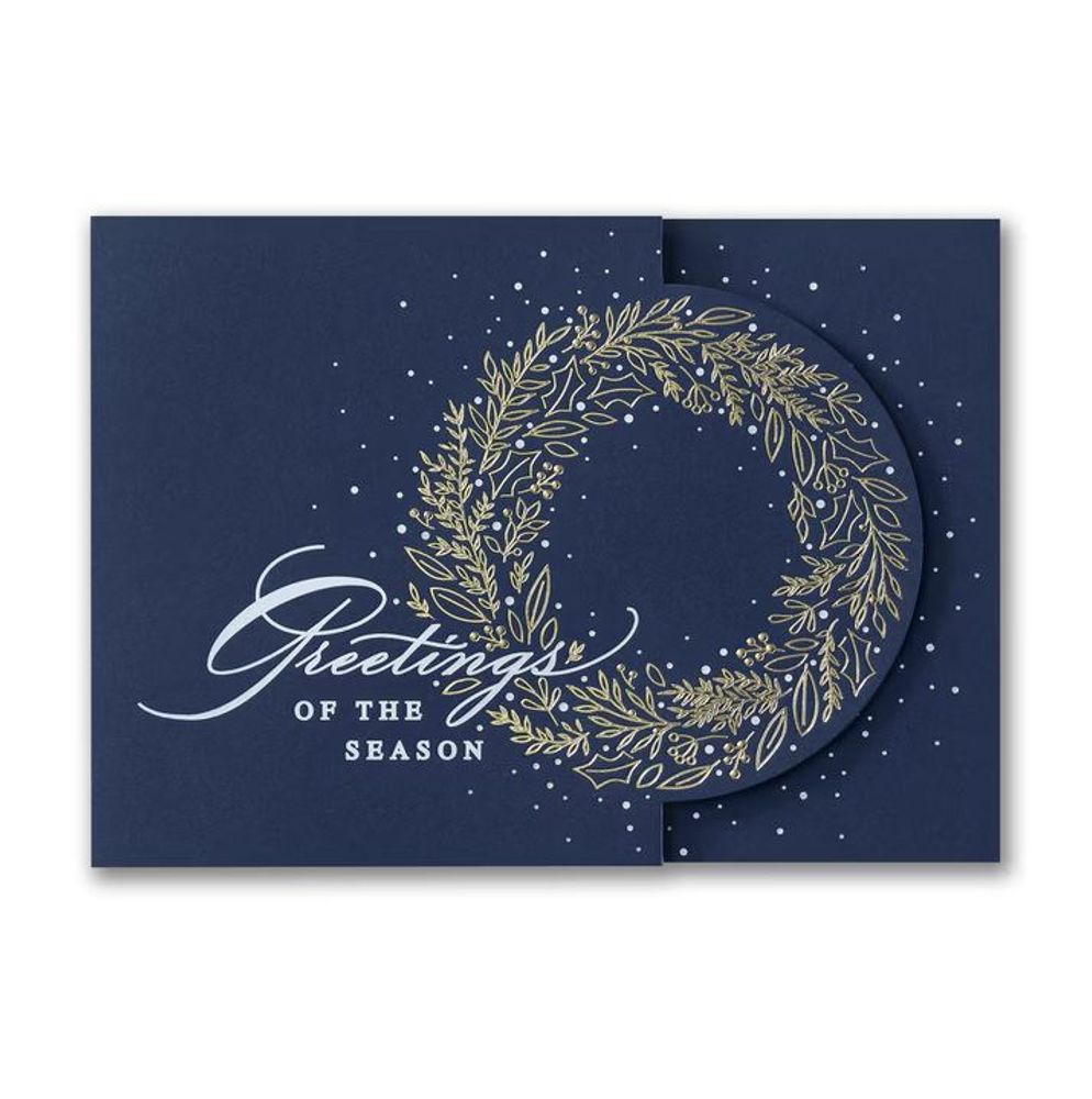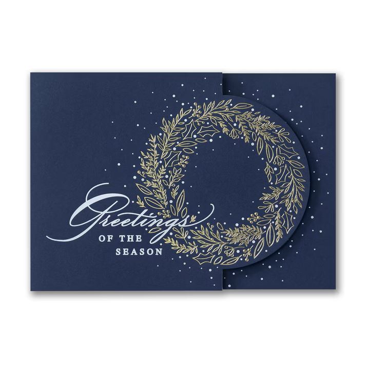 sku: UBS99680A gold foil wreath glimmers against a deep navy background while white foil presents the holiday message in pure style. This holiday card combines classic elegance with eye-catching foil detail. Dimensions: 7" x 5" Folded. Price includes printed card with blank envelope. Paper: Navy Smooth 100 lb. Features your logo inside the card.