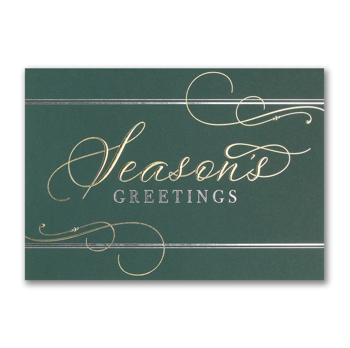 sku: UBS99683Bold and refined, this holiday card features deep green tones paired with gold foil embossing and silver foil printing. The elegant "Season's Greetings" message is elevated by sophisticated typography and metallic detailing. It's an ideal choice for businesses looking to send a polished and professional holiday greeting. Dimensions: 7 7/8" x 5 5/8" Folded. Price includes printed card with blank envelope. Paper: Hunter Smooth 100 lb. Features your logo inside the card.