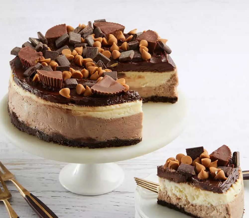 sku: ST25H149An outrageous chocolate cheesecake for the candy lovers out there! We start with a chocolate cake base, then add a layer of decadent chocolate cheesecake, then another layer of the famous NY cheesecake! Finally we top it off with chocolate fudge frosting, peanut butter chips, chocolate chunks and peanut butter cups! This delicious morsel includes a greeting card that you can personalize and is delivered in an elegant gift box. Serves 6-8.