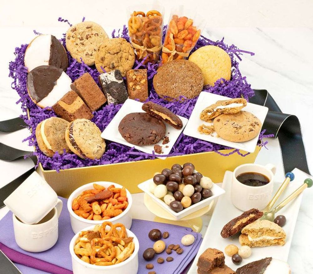 sku: ST25H146Surprise your recipient with this treasure chest of irresistible chocolate and bakery masterpieces! Savor pure bliss by sharing the finest creations, including four gourmet cookies (Chocolate chip, oatmeal raisin, snickerdoodle, and ginger molasses) four gourmet brownies (chocolate truffle, truffle walnut, cookies and cream and marble cheesecake) two stuffed cookies (double chocolate peanut butter and s’more), two sandwich cookies (chocolate chip and oatmeal raisin), two snack mixes ( Classic Pub and Hot N Spicy), two black and white cookies and NY Chocolate espresso mix). *Please note basket appearance may vary slightly During the summer months the sea salt caramels will be substituted with 4 Sandwich Cookies and the chocolate covered cookies will be replaced with 4 1oz cookies. Serves 22.