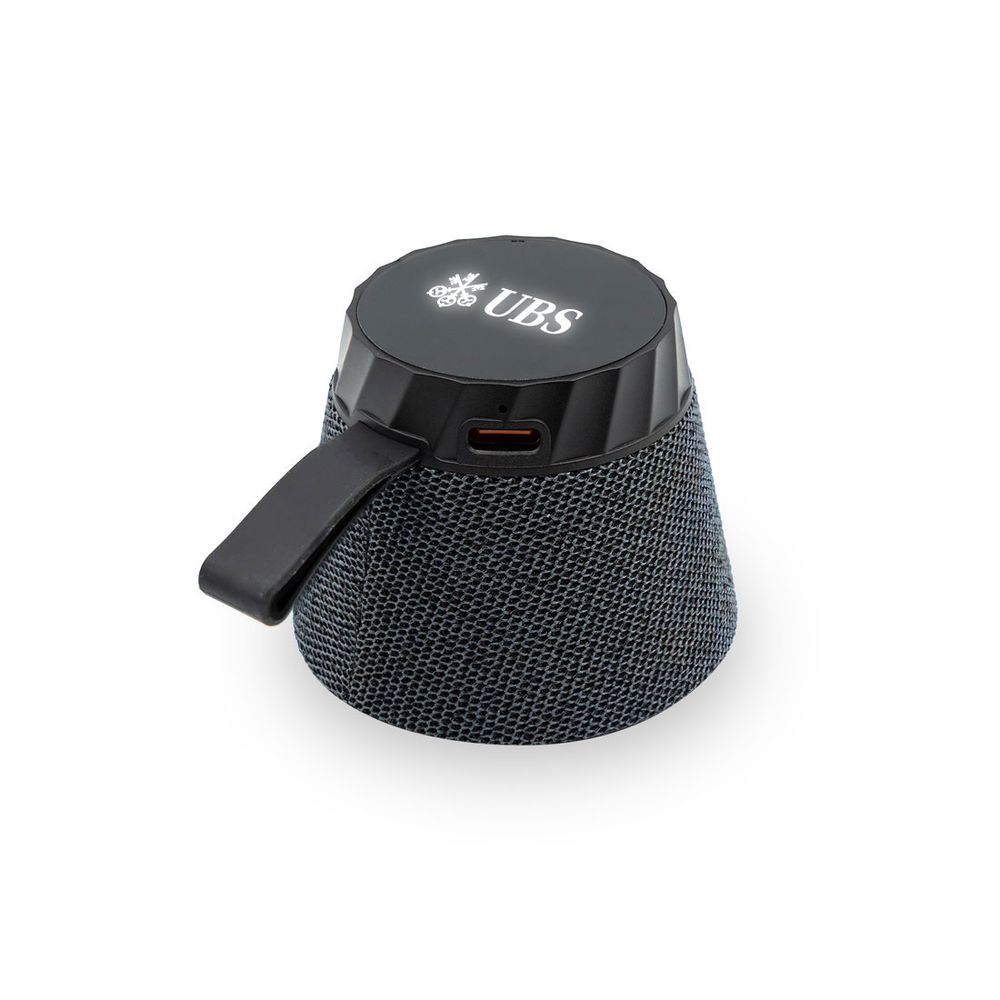sku: UBS2532Wrapped in all-around mesh with a rugged carabiner clip, this speaker is ready to go wherever you do. Its MagSafe compatibility lets you snap it to the back of your phone for instant sound, while the multi-function button doubles as a play/pause control and selfie shutter. Pair two units for stereo sound with TWS mode and enjoy wireless freedom powered by a 400mAh rechargeable battery. Small in size, big on versatility! Dimension: D 2 5/16" x H 1 13/16“. Features your logo printed on the top.