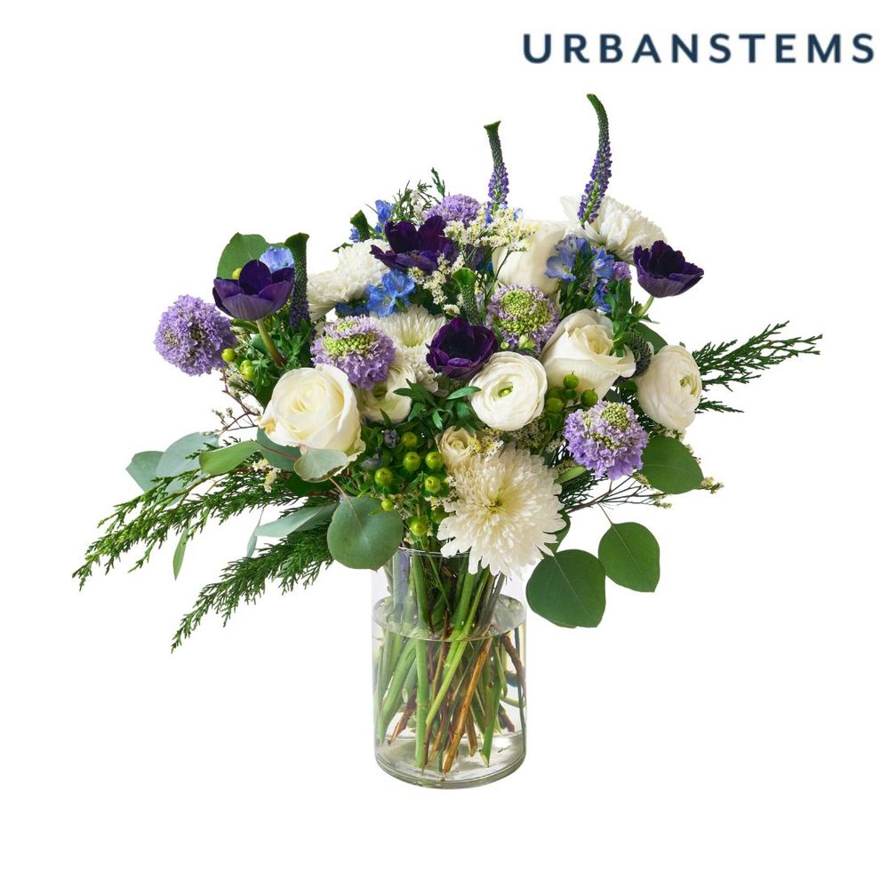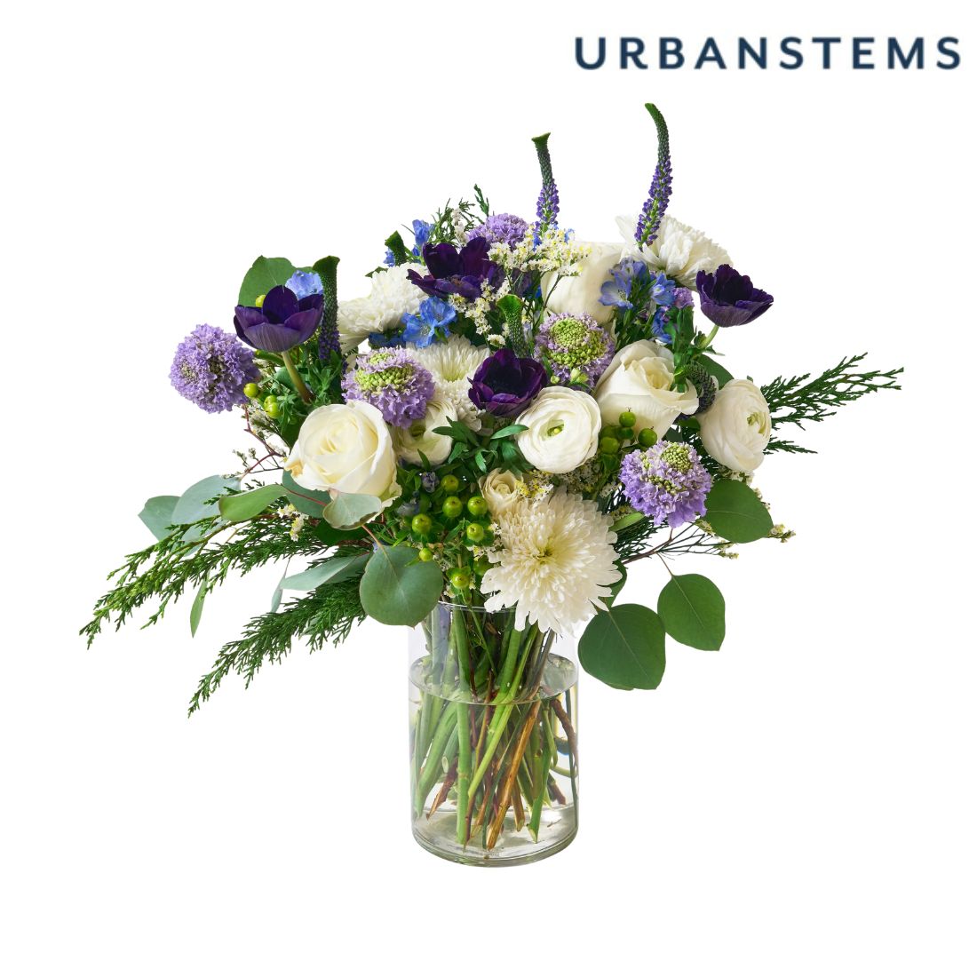 sku: STURB40It's somehow both a cozy hug and a festive celebration. Our designers paired enchanting white roses and mums with pops of cool purples and blue for a splash of winter cheer. It's not just a bouquet, it's a conversation starter, a wink and a nudge that says, "Yes, I know I look good!"