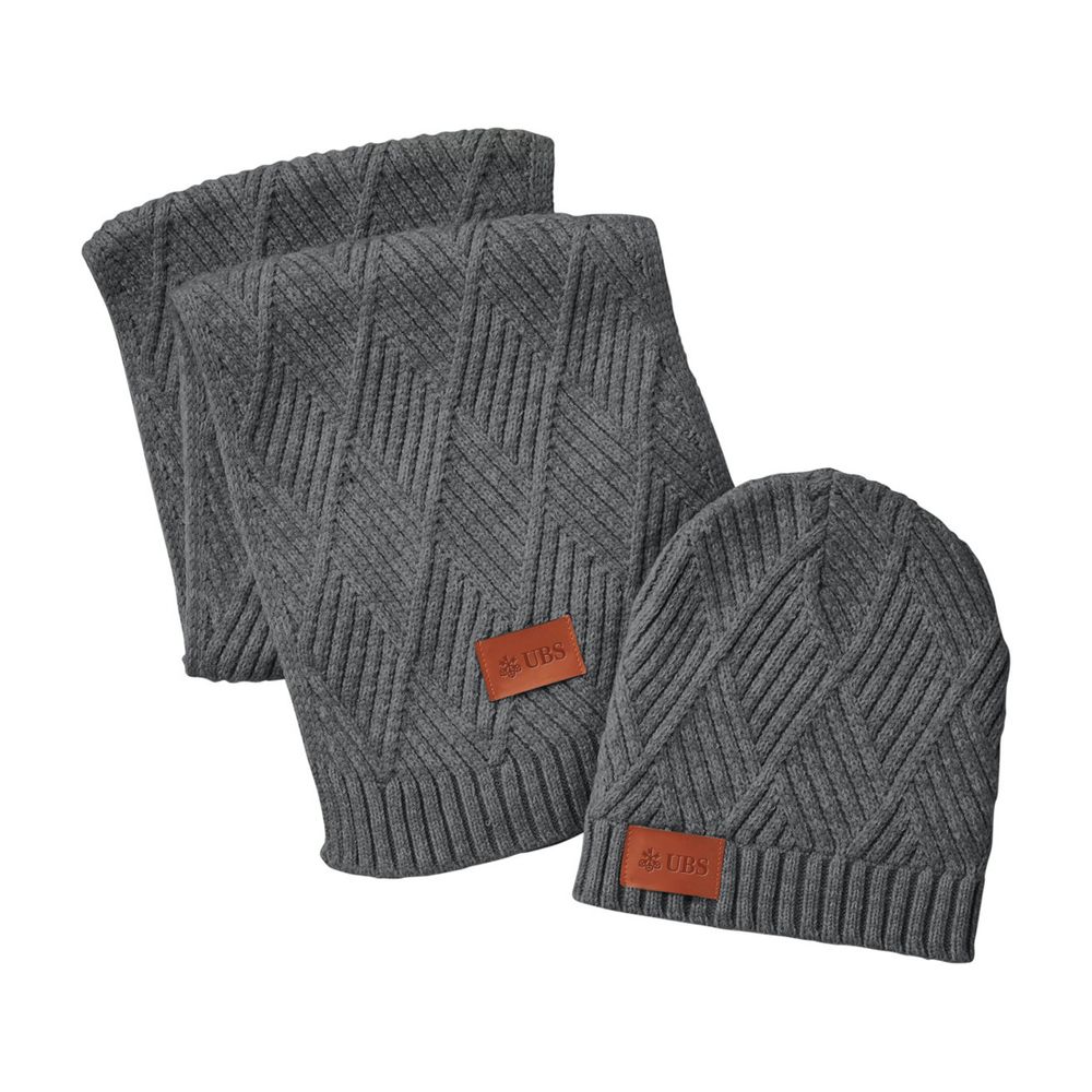 sku: UBS2603GYSet includes a matching heather knitted beanie and scarf. Each piece features PU faux leather patch featuring your logo. Components are one size fits most adults. Hand-wash only; do not iron.
