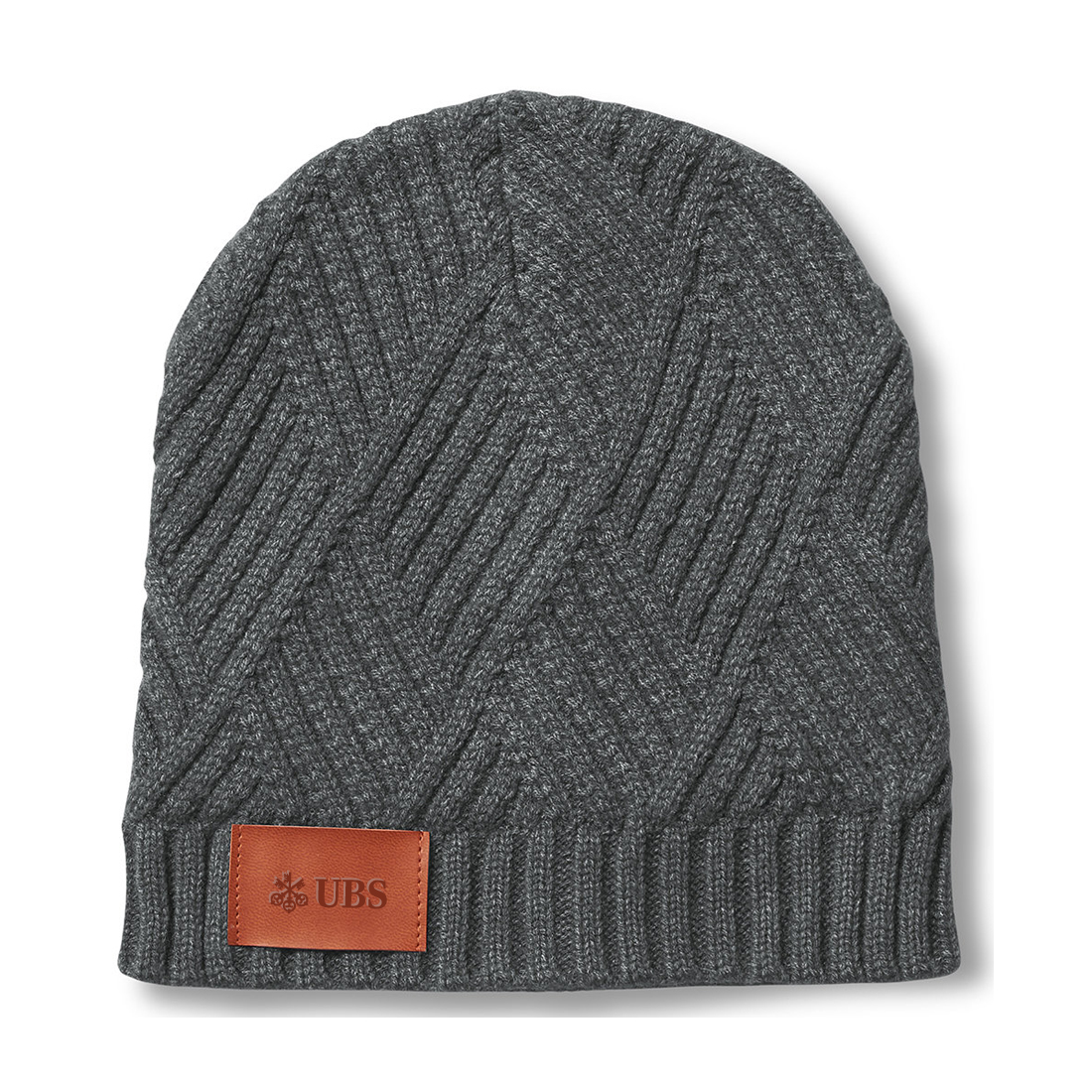 sku: UBS2604GYHeathered viscose, polyester and nylon blend beanie knitted in a trellis pattern. Includes a faux leather thermo PU patch featuring your logo. Do not iron. One size.
