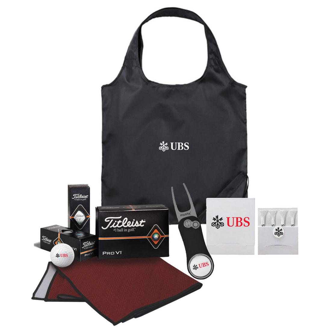 sku: UBS88576KKit includes: Microfiber Golf Towel (UBS2721), Titleist ProV1 - Half Dozen (UBS230HD), Pitchfix Classic Divot Tool (UBS203), Tee Pack (UBS204). Comes packaged in a Foldaway Shopper Tote (UBS2006).