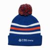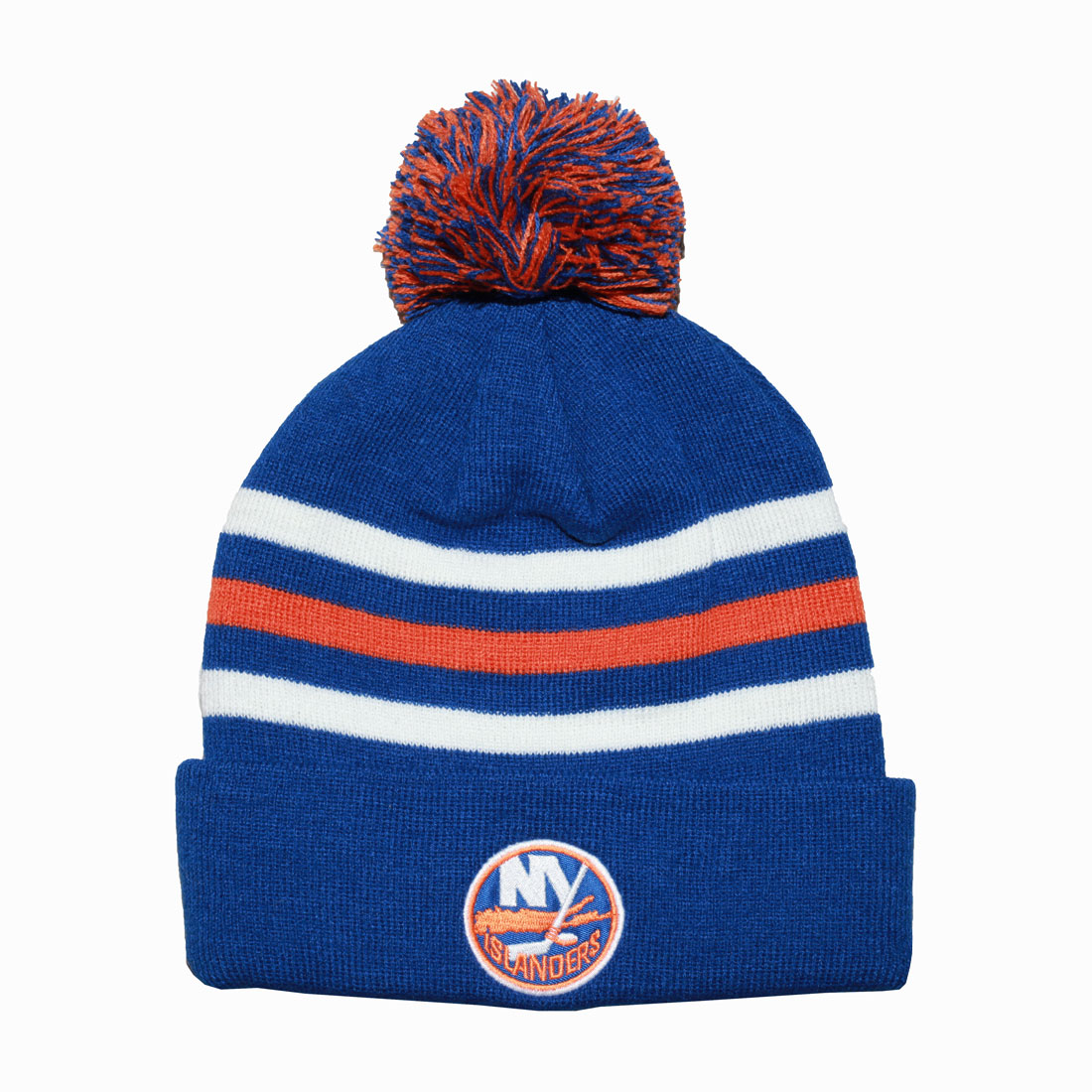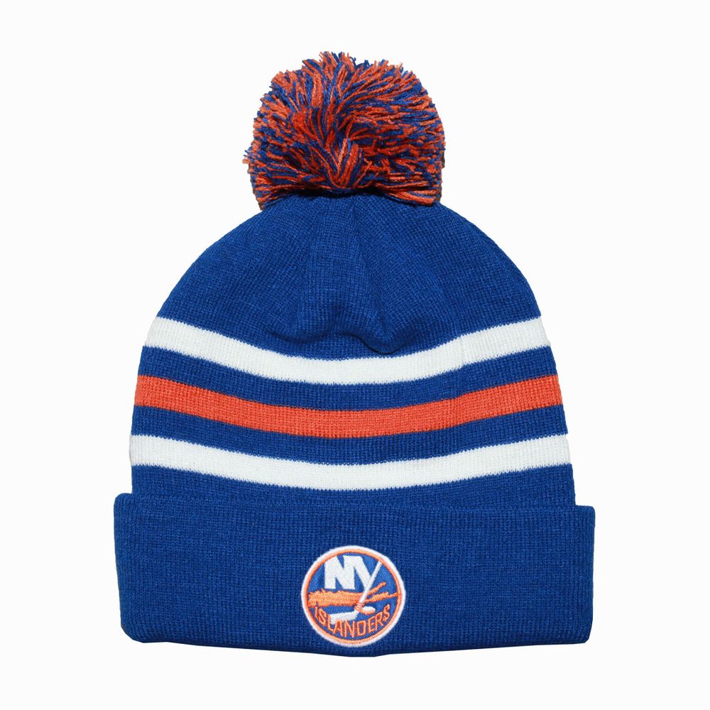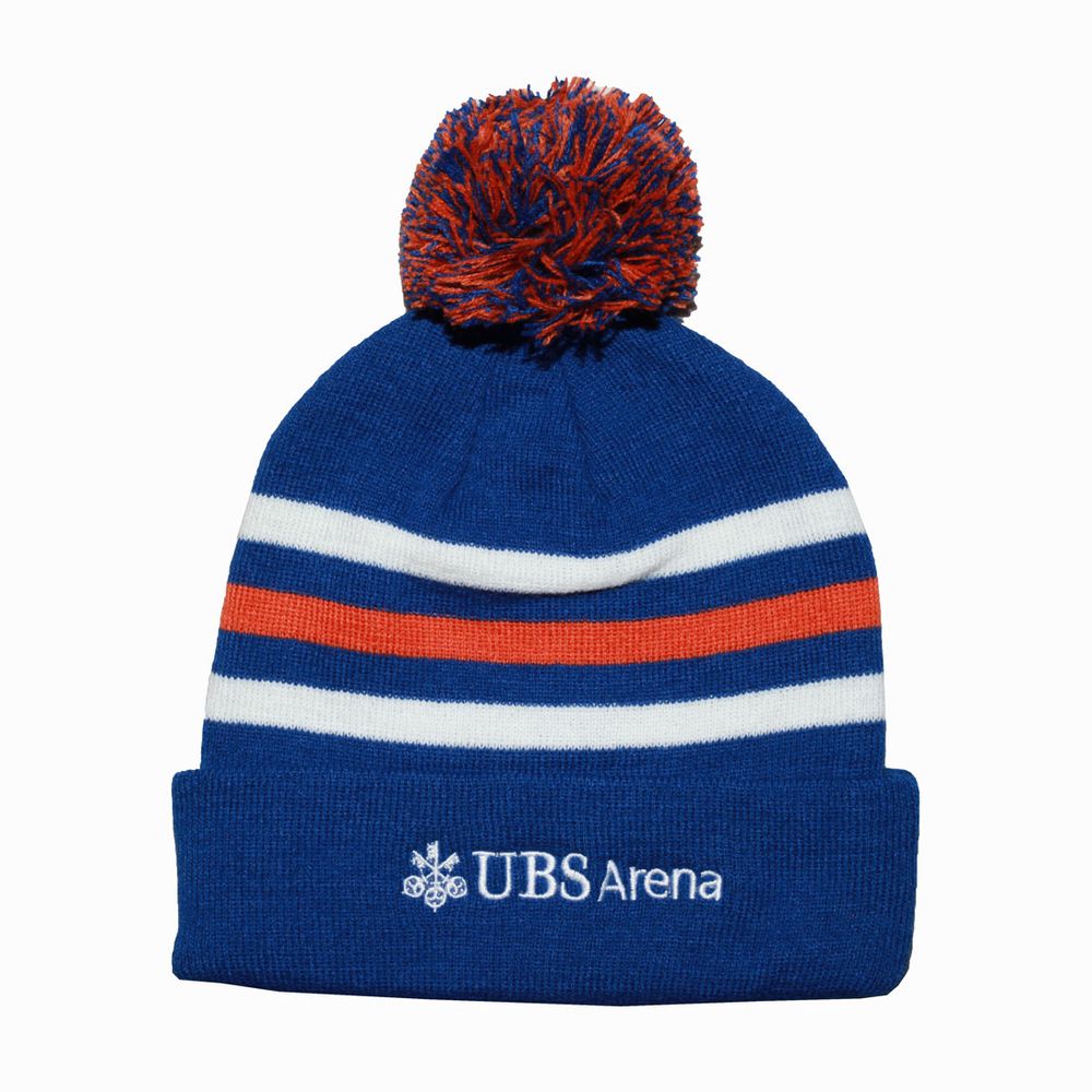 sku: UBSI885355WSLThis cozy royal toque hat with white and orange stripes features a pom on top with the NY Islanders logo on the front and UBS Arena on the back.