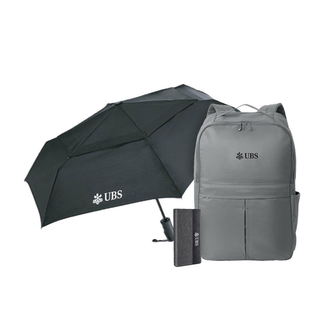 sku: UBS885434Bundle includes: Linen Cloth Wireless Charging Powerbank (UBS885337), Windproof Vented Auto Open Umbrella (UBS96946), Matte Backpack (UBS24H112SG).