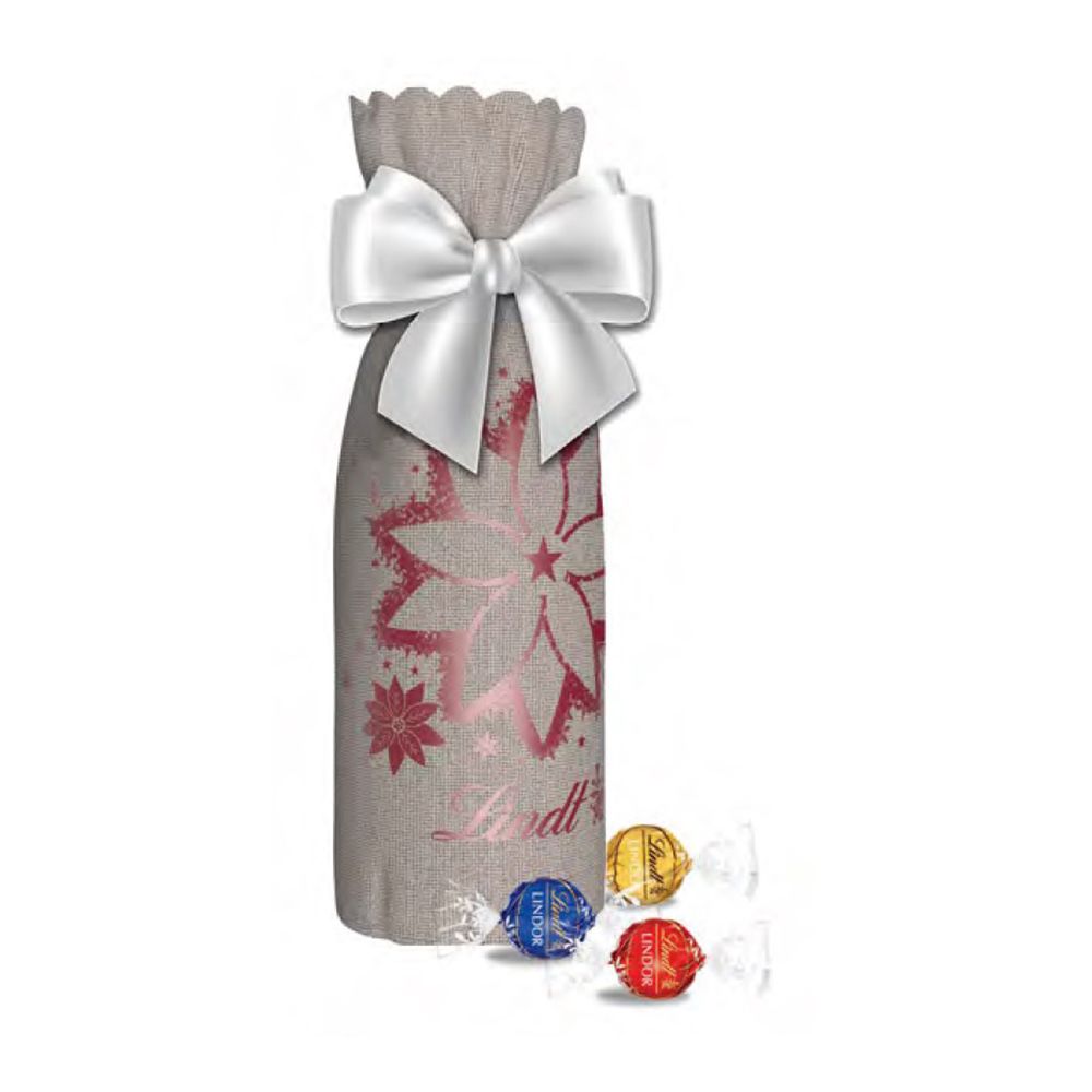 Lindor Holiday Gift Bag includes an assortment of 75 milk, dark, and white truffles 31.7 oz. Packaged in a burlap gift bag with ribbon.