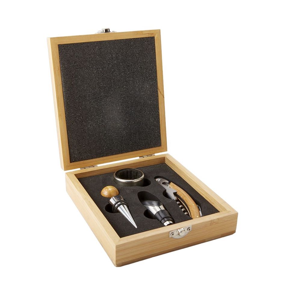 sku: UBS88840This Bamboo Wine Set includes a wine stopper, foil cutter, bottle opener, and pourer, all with bamboo accents. FDA tested. 6 5/8" H x 5 7/8" W x 1 7/8" D. Features your logo printed on the box.
